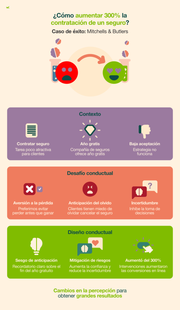 Los clientes tenían miedo de olvidar cancelar el seguro después del año gratuito, lo que llevó a la aversión a la pérdida. De esta forma, la anticipación del olvido y la incertidumbre sobre la cancelación inhibieron la toma de decisiones.